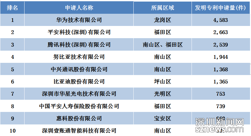 根据世界知识产权组织的统计, 深圳华为公司PCT国际专利申请5405件,居全球申请人第一位;深圳大学PCT国际专利申请201件,在教育机构申请量排行榜中超过哈佛大学的169件,位列全球教育机构第3名,中国高校第1名。